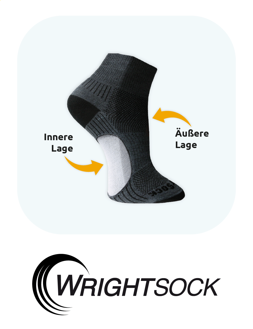 Zwei Sockenlagen sorgen dafür, dass sich beide Lagen gegeneinander Bewegen können und damit Reibung von der Haut fern halten. Zusätzlich sind beide Lagen an drei Stellen rutschsicher miteinander vernäht.