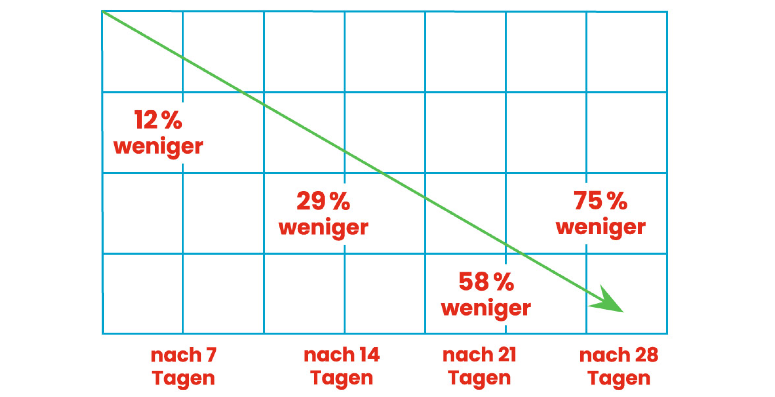 Bei regelmäßiger Anwendung (2x täglich) stellt sich in der Regel bereits nach wenigen Tagen eine deutlich sichtbare Wirkung ein. Nach 28 Tagen hat sich die Hornhaut dann bereits um bis zu 75% reduziert.