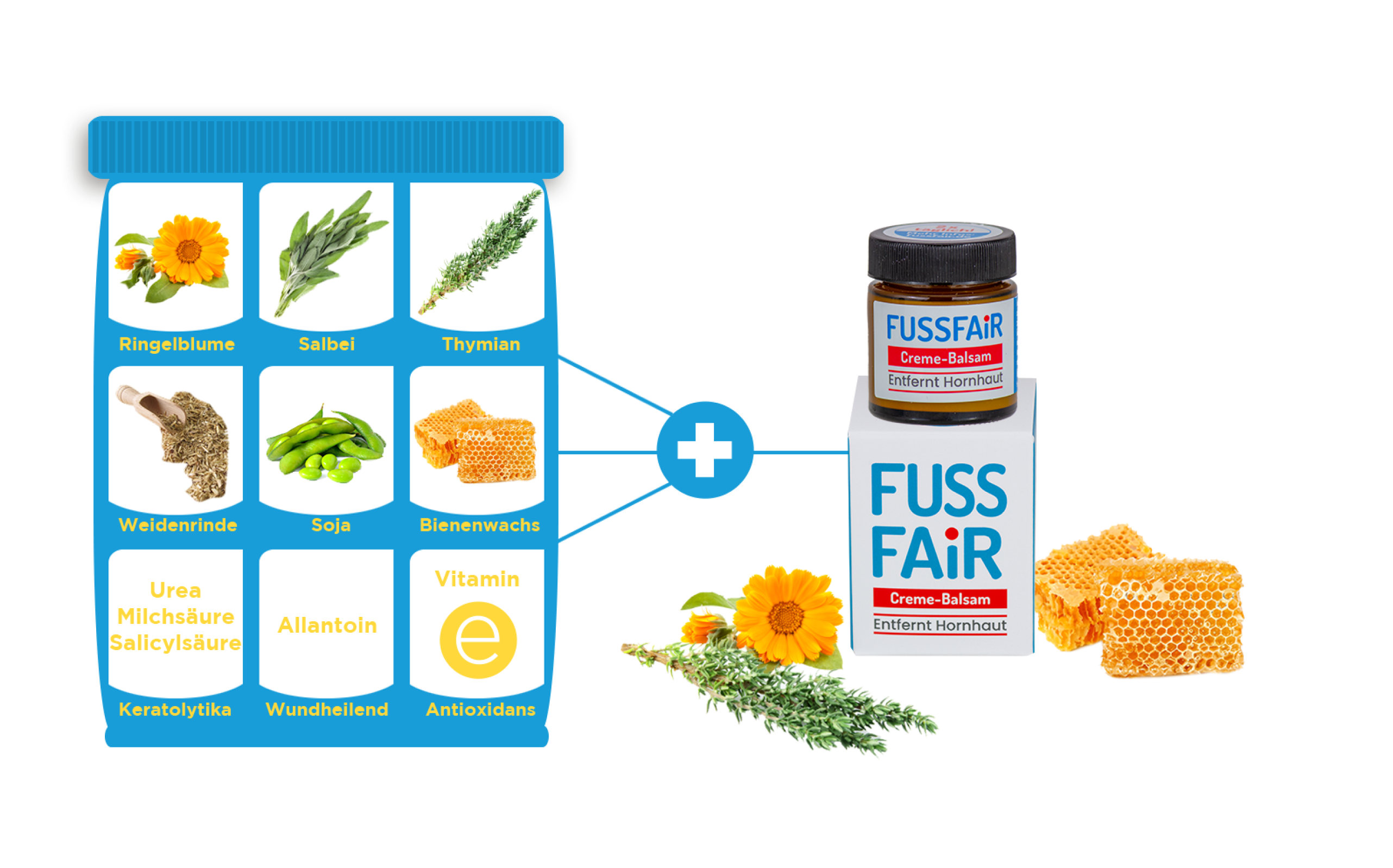 FUSSFAiR ist pflanzenölbasiert und mit Bienenwachsanteil hergestellt. Die beiden Hauptwirkstoffe sind Urea (Harnstoff) und Salizylsäure (kommt in Weidenrinde vor). Parabene, PEG's (umstrittenen Polyethylenglykole), Mineral- und-Silikonöle sowie synthetische Duftstoffe werden nicht verwendet.